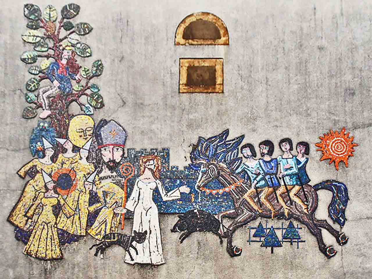 De oranje zon rechts op het mozaïek heeft als tegenhanger de gele maan links van de bisschopsmijter. Zoek zelf de vier dieren: eekhoorn, uil, kat en everzwijn.