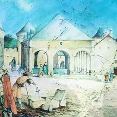 Aan de pleinzijde zie je op een schilderij hoe die Porte de la Roche er ooit uitgezien heeft.