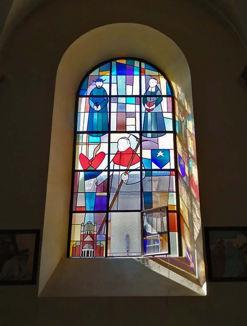 In 1995 bezoekt paus Johannes-Paulus II België. Als herinnering daaraan schenken Joseph en Christiane Michel-Adam een glasraam, gemaakt door het atelier Van Veerdegem-Vosch uit Elsene en geïnstalleerd in april 2009. Hierop zie je centraal de paus met links boven hem pater Damiaan en rechts broeder Mutien-Marie, beiden heilig verklaard, respectievelijk in 1995 en 1988.