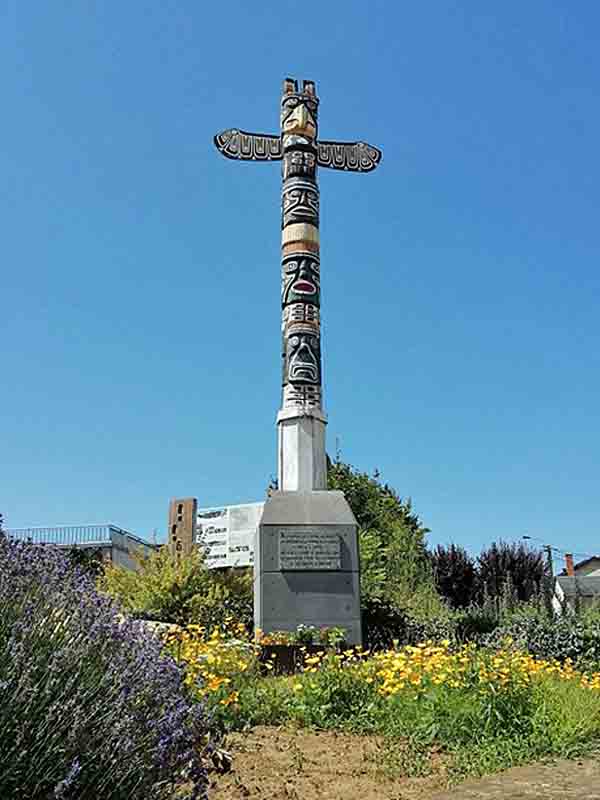 Frans president Charles de Gaulle trekt zijn land in 1967 uit deze Noord-Atlantische Verdrags Organisatie terug. Dat betekent het afscheid van die Canadezen, ze verhuizen op 31 maart 1967 naar het Duitse Lahn. Als aandenken aan hun gastvrije ontvangst schenken zij twee Canadese totempalen van het type Thunderbird, ook de naam van hun straaljagers. Eén exemplaar staat in het Franse Longuyon, het andere hier in Virton. Je ziet hier echter een kopie, gemaakt door Claude Goffinet uit Saint-Remy. Het origineel is in 1992 beschadigd geraakt.