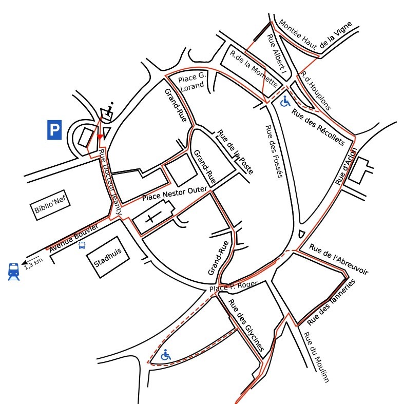 De Grand-rue doorsnijdt de binnenstad van noord naar zuid. Aan deze kant stond de Porte de la Roche ofwel Porte d’Ardenne, aan het andere uiteinde de Porte d’Harival of Porte de France.